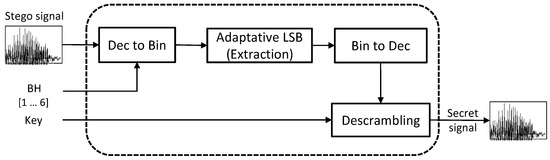 The objective of this module is to extract the secret voice message, by means of the following blocks: 16-bit conversion, adaptive LSB extraction, bit-to-sample conversion, and descrambling (Figure 2).