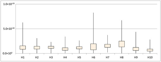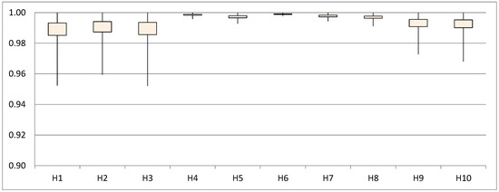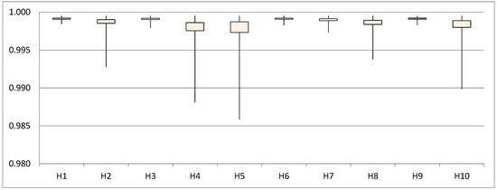 Consolidated results from the 600 imperceptibility tests are shown in Figure 4 and Figure 5. The measurement parameter is (Pearson Correlation Coefficient) between the stego and host signals, where the ideal value is 1 and the null correlation value, 0. The first analysis (Figure 4) is performed by arranging the results from each host signal that was used during the process (10 groups with 60 tests each, i.e. 10 secret messages by 6 values). This graph shows confidence intervals, where each box gathers 95% of the results. According to them, it can be inferred that the selection of a host signal has little influence in the secret message imperceptibility. In other words, regardless of the selected host signal, a very high imperceptibility is expected, since the value in the average test was higher than 0.988, and is over 0.985 in at least 95% of all the tests.