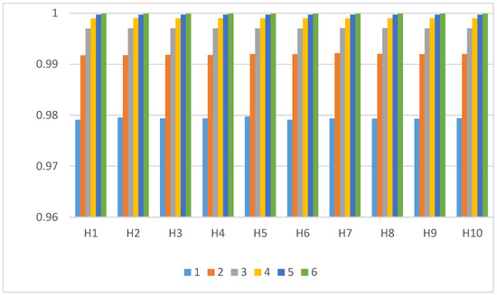 Similar to the imperceptibility evaluation, the results of the 600 tests for the quality analysis of the recovered secret message are gathered in terms of the selected host signal. Each group contains in turn the result of 60 tests, which consist of varying the secret message that is hidden (ten messages in total) and the value for each secret message (six different values). Figure 6 presents the results in confidence intervals of 95%, where it is evident that the recovered signals have soared similarities with the original secret messages, having an value above 0.985 in all cases.