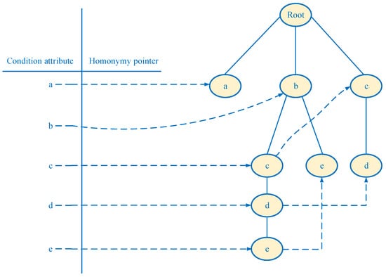 38] investigated an attribute reduction algorithm based on a discernibility information tree. This algorithm cannot only delete duplicate elements in the discernibility matrix, but also eliminate the influence of parent set elements in most cases and realize compression and storage of the discernibility matrix. Because the above research is carried out under the equivalence relation, and the number of elements in the discernibility matrix under the dominance relation is two times that under the equivalence relation, the advantage of the discernibility information tree compression and storage in the ordered information system is more obvious. Based on this advantage, we generalize the discernibility information tree of equivalence relation to dominance relation. Each attribute set is regarded as a path mapped to the discernibility information tree in the identifiable matrix. The same identifiable attribute set is stored on the same path. Compared with the identifiable matrix, the discernibility information tree eliminates the occupancy of the space of the repeated attribute set. For the attribute sets with the same prefix, take