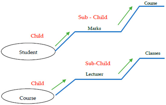 Relational database has an important feature of JOIN. But Oracle NoSQL database uses parent-child relationship instead of JOIN. MySQL database Student table (parent table) is linked with Marks table (child table) and Marks table (parent table) is linked with Course table (child table) and Course table (parent table) is linked with lecturer table (child table) and lecturer table (parent table) is linked with Classes (child table). In Figure 6, we see that Student is a parent table, Marks is a child table as well as the Course is a sub-child table and Course table is a parent table and Lecturer is a child table and classes are sub-child table.