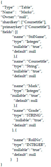 In Oracle NoSQL key-value store, these tables are stores in the form of Avro schema. Avro schema supports both APIs of Oracle NoSQL, and that is why the entire key-value store is based on this schema. Figure 7 shows the Avro Schema of tables stored in Oracle NoSQL store and Figure 8 shows Avro Schema of Marks table. Table API of the Oracle NoSQL key-value store is just a front-end layer to provide a user friendly environment.