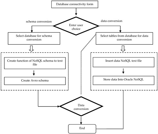 The approach discussed in the previous section is implemented in Java as Eclipse plugin. The implemented system starts working with the connectivity with a source relational database. After connectivity, two options will be displayed for conversion/transformation process. One is Schema Conversion and the other is Data Conversion. Which option is used depends on the user or administrator. If the user selects schema conversion, then the first step is to select the required database to transform into the Oracle NoSQL database. The next step is hidden from the user, which actually maps the databases and makes a conversion. In the last step, the transformed database schema will be displayed on the form. After creating schema from the relational to NoSQL database, a user can also transform data from MySQL to NoSQL. The second option is Data Conversion, if the user goes for this option, firstly, he will select the database and the required table from the database afterwards. The next step is to transform the data from the relational database to the Oracle NoSQL database. Consequently, a stored procedure is designed which transforms relational database data into Avro schema base JSON data. The entire working of the proposed system is shown in Figure 11.