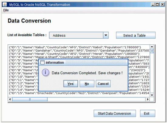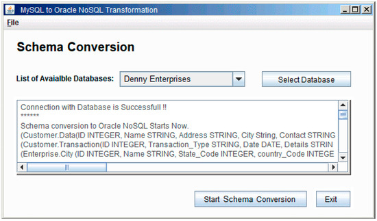 Figure 13 shows the screenshot of the data conversion module that allows the user to select a table name of the source database and it converts it into the Oracle NoSQL database table. Here, for the conversion, the approach discussed in Section 3.2 is applied and the results of the conversion are also shown in Figure 13.