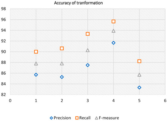 Precision. The precision can be attributed to as the accuracy of the designed system. Precision is measured by comparing the designed system’s number of correct results by all (incorrect and correct) results produced by the system, calculated as: In Equation (2), Ncorrect_transformations is the number of correct transformations generated by the approach and Nincorrect_transformations is the number of total incorrect transformations.