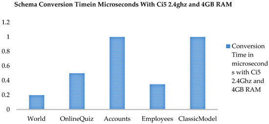 These databases first tested on schema conversion and the details of this conversion are shown as a graph in Figure 15. In this graph, the world database has three tables, onlineQuiz has five tables and accounts has six tables; however, the conversion time taken for OnlineQuiz accounts for more than double the world class because the OnlineQuiz and accounts database have multi parent child relationship, and therefore, it takes the max time.