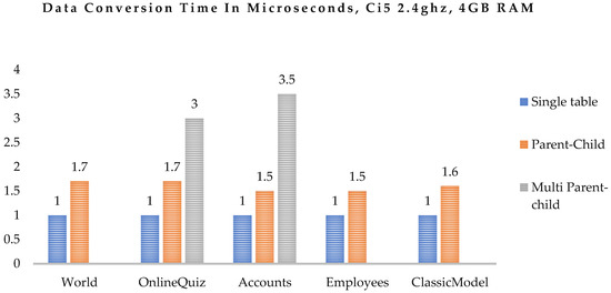 The data conversion time of databases is shown in Figure 16. The single table data conversion time is the same, in the parent-child relationship there is a minor difference in time, but in the multi parent-child relationship, the time is double the parent-child relationship. This is because in the proposed software prototype, the process of mapping parent-child relationship is time consuming. In this process phase, the system finds all foreign keys which are linked with the child table then it creates NoSQL key value store (JSON) storage schema of data and sends it to databases.
