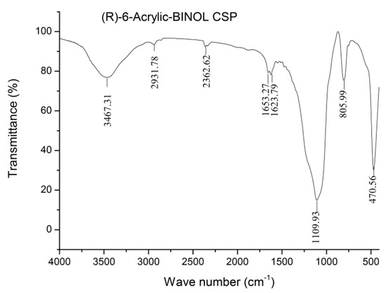 The infrared spectrum results (Figure 1) provided the structural information of the prepared CSP. The strong peak at 3467.31 cm−1 was attributed to the stretching vibration absorption (N-H) and the residual silanol group (O-H). The peak at 2931.78 cm−1 represented the stretching vibration absorption (C-H) of benzene rings. And the peak at 1653.27 cm−1 was the C=O of the carbonyl group. The peaks at 1623.79 cm−1 represented the stretching vibration absorption (C=C) of benzene rings. The strong peak at 1109.93 cm−1 was related to the single bond absorption (Si-O-Si, C-O). The data up-mentioned indicated that (R)-6-Acrylic-BINOL has been bonded to the surface of the acidified silica gel.