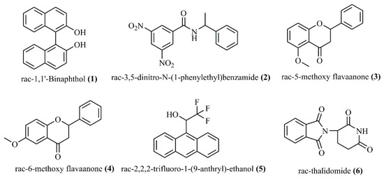 In this study, the following 6 solutes with the conjugated structure which, respectively, were rac-1,1′-Binaphthol (1), rac-3,5-dinitro–N-(1-phenylethyl) benzamide (2), rac-5-methoxy flavanone (3), rac-6-methoxy flavanone (4), rac-thalidomide (5), rac-2,2,2-trifluoro-1-(9-anthryl)-ethanol (6) (Figure 3), were chosen for the chiral ability evaluation of novel CSP. The separation results of enantiomers on (R)-6-Acrylic-BINOL CSP were listed in Table 1. The representative chromatogram data of (1) and (2) on the CSP were mentioned in Figure 4.