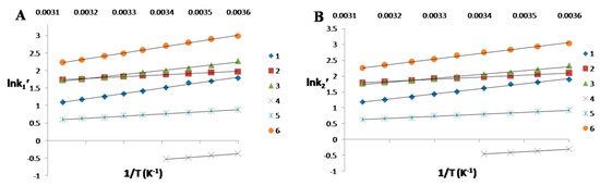 Van’t Hoff Plots of lnk1’ vs. 1/T (A) and lnk2’ vs. 1/T (B). (1: 1,1′-Binaphthol; 2: 3,5-dinitro–N-(1-phenylethyl) benzamide; 3: 5-methoxy flavanone; 4: 6-methoxyflavanone; 5: thalidomide; 6: 2,2,2-trifluoro-1-(9-anthryl)-ethanol.