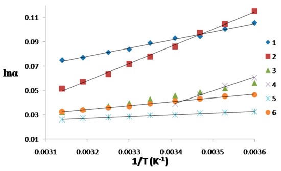 Plot of lnα vs. 1/T of 6 solutes. (1: 1,1′-Binaphthol; 2: 3,5-dinitro–N-(1-phenylethyl) benzamide; 3: 5-methoxy flavanone;4: 6-methoxyflavanone; 5: thalidomide; 6: 2,2,2-trifluoro-1-(9-anthryl)-ethanol.).