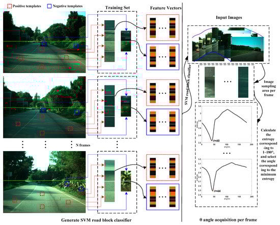 Therefore, in this paper, we propose implementation of an online road detection process on a shaded traffic image using a learned illumination-independent image (OLII-RD). We manually calibrate the road block and non-road block of the image sequence, and use the multi-feature fusion method to obtain the road block and non-road block color information matrix and the gray level co-occurrence matrix feature vector to establish the road block SVM classifier. A cascading Hough transform parameterized by a parallel coordinate system is used to acquire a road region of interest, and blocks of 30 × 30 pixels are randomly extracted from the region of interest. We use the SVM classifier to determine the five road blocks and combine them, and convert the RGB space of the combined road block into a geometric mean log chromatic space, and determine the camera axis calibration angle for each frame according to Shannon entropy, and then calculate illumination-independent images for the respective frames. The road sample points are extracted by the random sampling method in the safety distance area of the vehicle, and the road confidence interval classifier is established. The final road detection result is obtained by the road confidence interval classifier.
