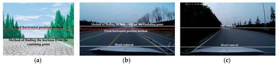 Results of sky and hood removal. (a) Effect comparison of the sky removal method on the uphill section, (b) effect comparison of the sky removal method and hood removal, (c) sky and hood removal.