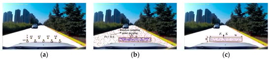 Due to problems, such as the camera erection position and camera shooting angle, the actual collected traffic road image often has a hood. The hood occupies the road area in the image and later interferes with the selection of road sampling points in Section 4.3, which in turn affects the detection of the road. Considering that the camera erection position is relatively fixed, we use the manual calibration method to remove the front part, as shown in Figure 2b,c. The specific steps are as follows:
