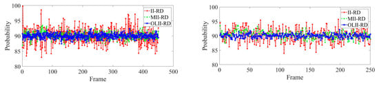 In this section, the calculation time of II-RD, MII-RD, and OLII-RD at each stage is calculated. This experiment uses Windows 10 64-bit operating system, CPU is Intel Core i5-4570, 3.2 GHz, 8 G PC as the experimental platform, and the experimental environment is MATLAB 2017b. In this part, the random sampling method is used to randomly extract 100 frames from the public dataset and the self-built dataset for time validity analysis experiments. For the resolution of the image frames of the two data sets, we use clipping and quantization processing to uniformly quantize to 640 × 480.