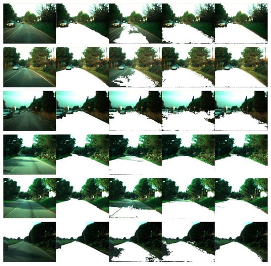 Comparison of road detection results for CVC datasets. From left to right: Original image, groundtruth map, result of II-RD, result of MII-RD, result of our method, respectively.
