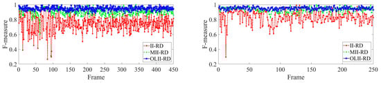 The definition is as follows: ① Accuracy rate, P, ② recall rate, R, ③ comprehensive evaluation index, F. Let be the real area of the road, and be the actual detection result of the road surface, then , , , . P and R are complementary, F is the weighted harmonic average of P and R, and can reconcile and comprehensively reflect the accuracy, P, and the recall rate, R. The closer F is to 1, the better the road detection effect. Because we use the random sampling method, the P, R, F values have slight fluctuations, and the standard deviation of the fluctuation is . The comparison of the performance indexes of the three methods is shown in Table 2. The comprehensive evaluation index, F, curve of the three methods for each frame image detection result is shown in Figure 7.