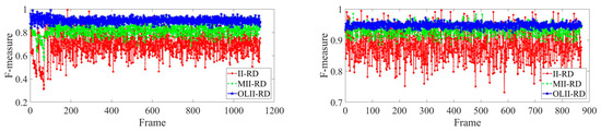 Comparison graph of F value for detection algorithms for VRR datasets. From left to right: F curve for S1 and S2 video sequences, respectively.