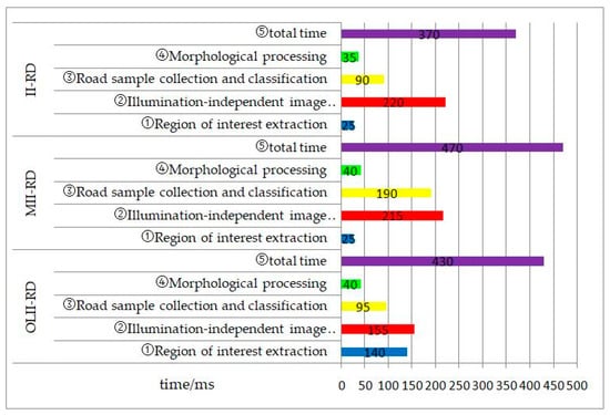 With a uniform processing standard, our current implementation is non-optimized MATLAB code. Figure 11 shows the average processing time for each of the three methods in each of the two datasets. II-RD and MII-RD removed the upper third of the image, respectively, and OLII-RD uses the horizon determination algorithm to remove the area above the horizon. It can be seen from the figure that the total processing time of MII-RD is the longest, the time is about 470 ms, and the road sample collection time is relatively long. The least time spent on total time is the method of II-RD, and the time is about 370 ms. The total time consumption of OLII-RD is about 430 ms, which is somewhere in between. Although, the paper uses the online acquisition, , angle and the time consumption in the extraction stage of the region of interest is more than II-RD and MII-RD. However, the obtained road area of interest is more concentrated, and the number of pixels processed is relatively small, which saves more time for the subsequent illumination-independent image acquisition stage.