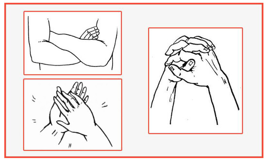 This complex of tasks, with some degree of assumption, we refer to below as psychophysiological testing. Tasks 1–3 were performed in triplicate: during conversations with the subjects, they were asked three times (with different time intervals) to perform a certain action—clasp their hands, applaud, and fold their arms—and then the average was taken. For the hand-clasping task, the subject was asked to clasp their hands with interlaced fingers (Figure 1) to see the which hand’s finger was on top; this was repeated three times, without attracting the attention of the subject and alternating with other tasks. For arm folding (Figure 1), we noted which forearm was on top; this also was repeated three times, as with the first task, without attracting the attention of the subject. When performing the task of applauding, the subject was asked to applaud, to see which hand was above. The action also was repeated three times, without attracting attention. It is believed that when performing these tasks, fingers, the forearm, and the hand of the dominant hand are above [70].