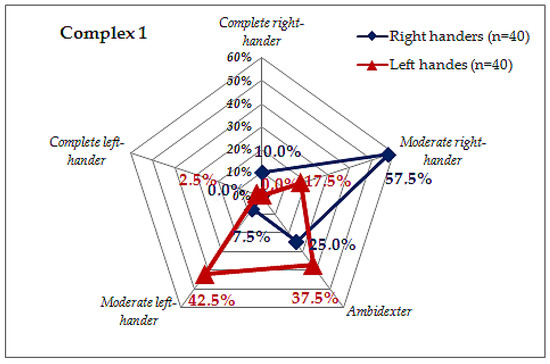 At the first stage, the results of complex no. 1 were evaluated according to the ratio of the answers (Table 1), and when compared with the results of test complex no. 2, each task of complex no. 1 was assigned a number of points: 3 points for right-handedness, 1 point for left-handedness.
