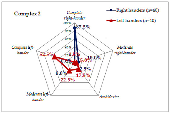 The answers were weighted on a 3-point scale: 3 points for right-handed, 2 points for neutral, and 1 point for left-handed. Handedness was classified by the sum of points according to the scheme given in Table 1. In addition, we evaluated the test results of each individual by calculating the average value for complex 1 and complex 2. The score ranged from 3 points (absolute right-hander) to 1 point (absolute left-hander). A score of approximately 2 points was characterized as ambidextrous.
