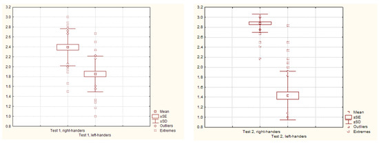 Among the right-handers, the dominance of the right hand and the right eye when performing the complex of tasks was 67%, whereas, among the left-handers, only 45% showed L-reactions and 37% showed an inclination toward ambidexterity (Figure 2). There were no differences between sexes in either group during task performance (Table 2). The assessment of handedness in points showed that the average score of right-handers was 2.4 (moderate right-handedness), and left-handers only scored 1.9, i.e., the results were very close to a score indicating ambidexterity. The differences between left-handers and right-handers reached a statistically significant level (Table 2).
