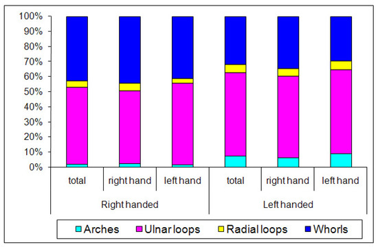 The analysis of fingerprints revealed no significant sex differences in the occurrence and distribution of fingerprint patterns in either left- or right-handed group. Comparison by handedness showed that left-handers were statistically significantly more likely than right-handers to have arch patterns, which were distributed symmetrically on both hands: if they were found on one hand, it was more likely to also be on the left. At the same time, in right-handers, arches were more often found on the right hand. Radial loops were most often observed on the index finger of either hand and, in left-handers, they had a significantly higher occurrence on three to five fingers of the left hand.