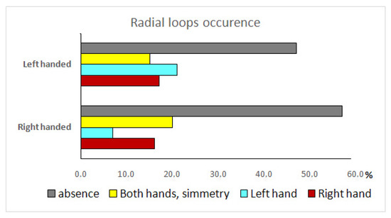 At the individual level, radial loops were observed in 34.62% of left-handers and 30% of right-handers. It is necessary to point out the high intragroup variability: right-handers of both sexes were characterized by a common trend: a higher occurrence of radial loops on the right hand. Left-handers demonstrated two trends: in men, it was the same trend seen in right-handers—radial loops occurred more often on the right hand—while in women, radial loops were more often observed on the left hand (Table 7). However, the differences did not reach a statistically significant level in either the comparison by sex or by handedness. This lack of significance is why we considered it reasonable to examine the combined samples of left-handers and right-handers. By doing so, we observed a similarity in the occurrence of radial loops on the right hand of the right-handers and on both hands of the left-handers, while on the left hand of the right-handers, they were found much less often (Figure 6). Also, right-handers had radial loops mainly on the index fingers of both hands, while left-handers were characterized by a higher occurrence of this pattern on from the third to fifth fingers (Table 7). The analysis of the asymmetry of the distribution of radial loops on the right and left hands showed that, in general, the right-handed subjects were characterized by positive asymmetry of the distribution of this trait, i.e., by a higher occurrence on the right hand. For the left-handed subjects, the picture was more complex: in women, there was pronounced asymmetry, where an association of radial loops with the left hand was observed; in men, the distribution was almost uniform, with a somewhat greater occurrence on the right hand (Table 7 and Table 8).