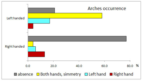 In left-handers, a lower occurrence of whorls was accompanied by a higher occurrence of arches. At the individual level, arches were observed in 23.08% of left-handers and 16% of right-handers. We propose that it is the occurrence of arches that is the most evident dermatoglyphic marker distinguishing between right-handed and left-handed people at the group level. Left-handers were observed to have a higher occurrence of arches on either hand, often on both hands simultaneously, as well as a high proportion of individuals who had three or four arches on the fingers of one hand (Table 10, Figure 7). In the analysis of this pattern type, no sex differences within the groups were observed, while most of the differences between left-handers and right-handers were characterized by statistical significance (Table 10). Directional asymmetry in the distribution of this pattern type was positive in right-handers and negative in left-handers, with differences reaching a statistically significant level (Table 8). Similar results were obtained by L. Kerkadze et al. [42]. They noted that, in left-handers, arches were found almost twice as often as in right-handers, and they were mainly on the left hand, while whorls and loops were more often seen in right-handers. However, Sinha et al. [46] noted that left-handed samples were characterized by a high occurrence of modified radial loops and tented arch as compared with right-handers.