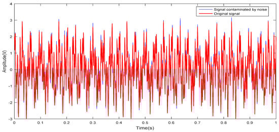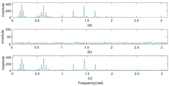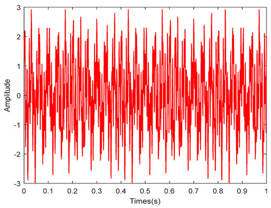 Let us take , signal-to-noise ratio SNR1 = 13.5392 as an example. The time domain waveforms of the three signals , , are shown in Figure 5, and the frequency spectrum, i.e., frequency domain waveform, is shown in Figure 6.