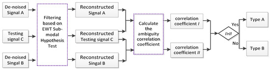 Firstly, EWT is used to decompose the signal into sub-modes, and the Gaussian distribution hypothesis test was carried out one-by-one for all sub-modals. The sub-modals which are judged to obey Gaussian distribution, namely Gaussian noise, are removed to reconstruct the signal. Then suppose class A signal and class B signal are classified and calculate the ambiguity correlation coefficients of test signal C and class A and class B, respectively. For which ever correlation coefficient is higher, the signal C belongs to that type. The basic process can be represented in Figure 8.
