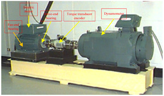 In this paper, the data of Case Western Reserve University was adopted for analysis and collected vibration signals were applied for detection. The test bearing was the drive end bearing of a deep groove ball bearing, model SKF6205. Inner and outer rings of the bearing were locally damaged manually using an electric discharge machine, and piezoelectricity plus a sensor mounted on the upper end of motor output support bearing was used to collect the data. The field acquisition device is shown in Figure 9.