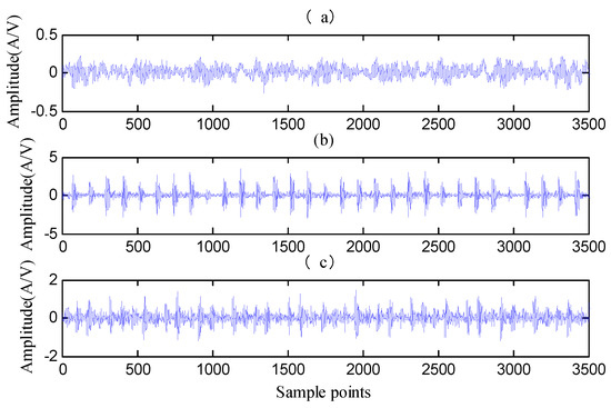 Bearing speed was 1797 r/min. At 12 kHz sampling frequency, the collected data length N was 3500 points. They were normal signals, outer ring fault signal and inner ring fault signal. Respectively, as shown in Figure 10.