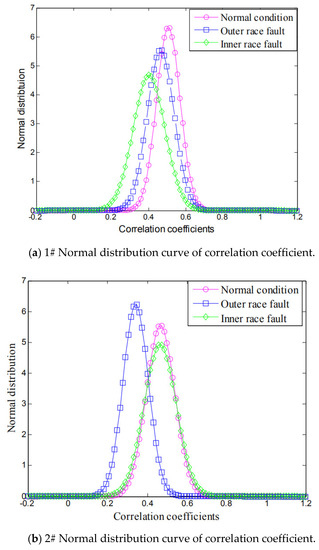 There were three sets of data 1#, 2#, and 3#, whose types were known as normal state signal, outer race fault signal, and inner race fault signal, respectively. The ambiguity correlation coefficients between normal working state signal and three known types of signals were calculated, and the mean and variance of the correlation coefficients were counted. Similarly, the ambiguity correlation coefficients between the outer race fault signal, the inner race fault signal, and the three known types of signals were calculated, respectively, and the mean and variance of the correlation coefficients were counted. The mean and standard deviation based on EMD are shown in Table 3, and the mean and standard deviation based on EWT are shown in Table 4. Comparing the data in Table 3 and Table 4, we find that in Table 4, the correlation coefficient between the rolling bearing signal and the same type of data set is always the largest, regardless of the working conditions of the rolling bearing. On the other hand, in Table 3, the identification of the bearing’s working condition is not obvious. Even when the rolling bearing is in the outer race fault state, the correlation coefficient between the rolling bearing signal and the 1# data set (the normal signal data set) is greater than that between the rolling bearing signal and the 2# data set (outer race fault data set). That is to say, the probability of identifying errors is very large at this time. The modal aliasing phenomenon exists in the decomposed signals by EMD, so the ambiguity correlation coefficients of the three decomposed signals are not distinguished clearly, and even produce errors. The information obtained by EWT decomposition is more effective, and the classification of signals can be clearly separated by ambiguity correlation coefficient. The normal distribution curves of the above results are shown in Figure 11 and Figure 12.