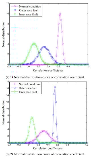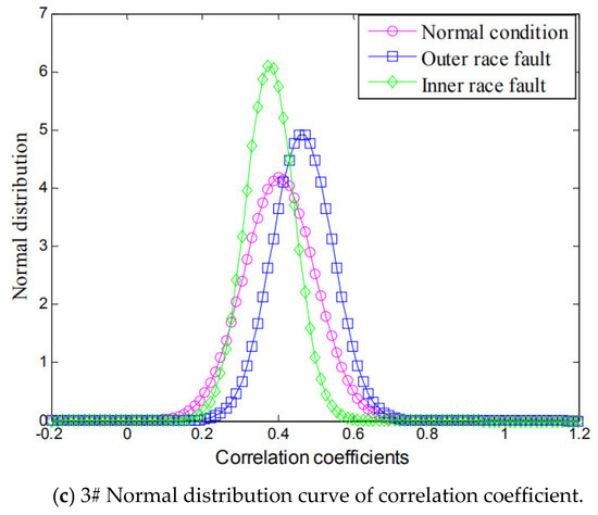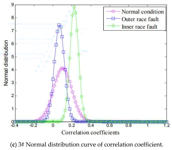 Figure 11 and Figure 12 show more clearly the two methods for the identification of the three working conditions of the rolling bearing: the center of normal distribution of correlation coefficient based on EWT can well identify the signals produced by rolling bearings in different working conditions, while the normal distribution curve discrimination based on EMD correlation coefficient is not obvious or even wrong in signal recognition.