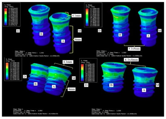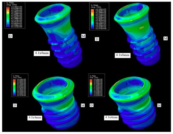 Distribution of the main tensions in the short implants located at the level of the first upper premolar. On the left of the figure, the load on the crown of the implant-supported fixed partial prosthesis is observed on an implant of 4.1 × 8 mm (on top) and 4.1 × 4 mm (below). To the right of the figure, the load in the cantilever is observed. Tensions are observed in the cervical and middle third.