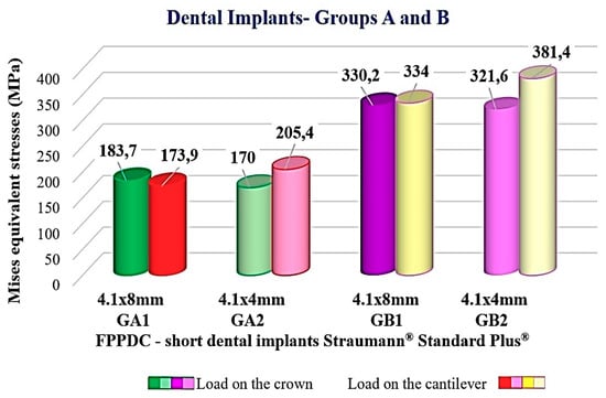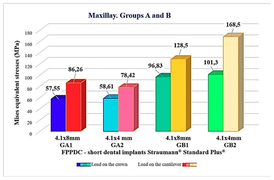 On the other hand, Lemos et al. [] compared short implants (≤8 mm) with standard implants (>8 mm) placed in the posterior regions of the maxilla and the mandible and found that shorter implants >8 mm presented a greater risk of failure. Block et al. [] analyzed the level of bone deformation when changing the prosthetic design and different occlusal schemes. It was found that the restorations with splinted implants reduced the levels of deformation in the area of the neck of the implants and provide a better deformation distribution under cyclic load. De Souza Batista et al. [] compared the influence of the pontic designs and the effect of mesial and distal cantilevers in prostheses supported by standard implants (4 × 10 mm). Axial forces of 400 N and of 200 N were applied in an oblique direction. In the group with two implants supporting a distal cantilever, an unfavorable biomechanical behavior with higher stresses was observed.