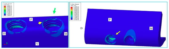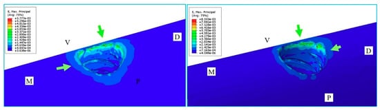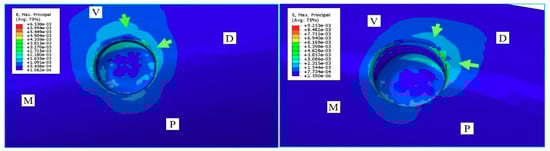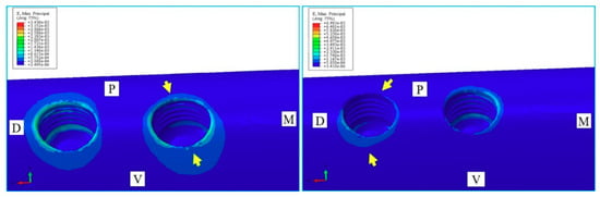 Microstrain in the maxillary. Load on the crown (left) and the cantilever (right) of the PPFIVD supported by two ultrashort implants of 4.1 × 4 mm. Arrows indicate microstrain in the bone crest.