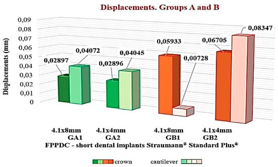 In the present work, there were no observed differences between GA1 and GA2 implants. The tensions in GB2 were, principally, greater than those of GB1. However, GB2 (4.1 × 4 mm) exerted higher tensions, an unpredictable situation for implants of short height. Ormianer et al. [] studied the marginal bone loss related to implants of different designs, (different threads, thread direction, and apical design). In the long-term, there was minor bone loss in implants with greater interthread distances, deep apical turns, and narrow cores. Their results favored a single-piece implant design with a “V” thread design. Wolff et al. [] demonstrated that the effective tensions take place in the bone–implant interface under unidirectional axial load. Four types of implants showed bone loss resulting from pathological tensions >3000 µε. The groups analyzed in the present work were in the rank of pathological overload; this favored the micro deformations and the displacements of the implant/abutment connections.