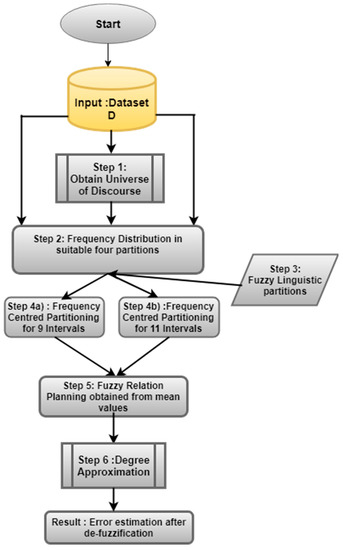 Fuzzy-based time series forecasting is used to examine information which is neither explicit nor precise. Researchers have developed fuzzy time series perceptions and definitions to deal with imprecise and vague information systems where decisions or predictions could be carried out. This was later proposed by Song and Chissom, who also portrayed a special dynamic forecasting process with linguistic values [1,2,15]. Fuzzy forecasting to predict links in social networks has been described by authors in [16]. Later, the authors in [12] formally defined a fuzzy time series model described in Section 2.2.