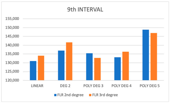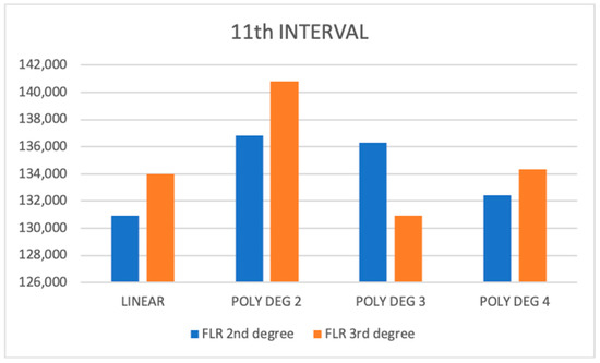 In Figure 3, the FLR 3rd degree MSE is generally higher than FLR 2nd degree MSE except in case of polynomial degree 3. We can infer that Linear FLR 2nd degree polynomial has the lowest MSE among all the cases for 9th interval. It is convenient to estimate a particular case is the best among all others. As it can be inferred from the graph, total 10 cases for 9th interval has been monitored. We have also worked on 8 cases in 11th interval partitioning as shown in Figure 4.
