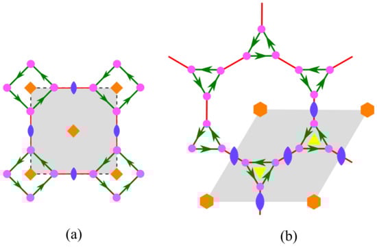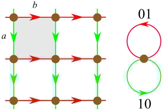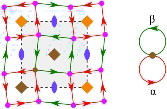 As an illustration of the general method, we consider the description of the sql net from its labeled quotient graph, the bouquet , as given in Figure 1. In this case, according to the vector method [], voltages are vectors in , and the generated group is a translation group of rank 2. The vertex set is defined as . If two orthogonal vectors a and b are used as a basis of the lattice in the plane, with correspondence and , one obtains the derived net with the orientation as given in Figure 1. We observe that, locally, the derived net has the same structure as the voltage graph: for each color, there is one outgoing and one incoming edge at every vertex. The green edge links vertex to vertex , and the red edge links vertex to vertex .