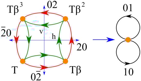 The isomorphism between the derived net N and sql can be worked out through labeled quotient graphs, as indicated in Figure 3. There are indeed two freely acting automorphisms of that leave the voltages over cycles unchanged and that should be interpreted as images of translations in N, thus extending the group T. We first define the automorphism exchanging (i) T with and with ; (ii) green and red horizontal edges between T and , as well as those between and ; and (iii) vertical edges between T and with those of the same color between and . A second automorphism is defined similarly, this time exchanging colors for vertical edges and keeping colors for horizontal edges; and act on as reflections in the blue v and h lines, respectively. The graph thus has a single vertex class and two edge classes for the automorphism group ; the four horizontal edges form a first class and the four vertical edges form a second class. Hence its quotient is the bouquet with all horizontal edges mapped on the upper loop and all vertical edges mapped on the lower loop. More precisely, both 2-cycles with voltage 02 (resp. 20) are wrapped on the upper (resp. lower) loop. This means that the voltages on the loops are respectively 01 and 10.