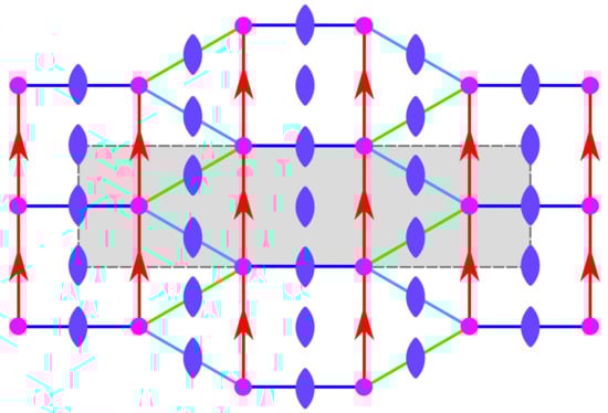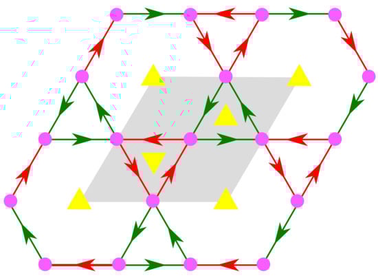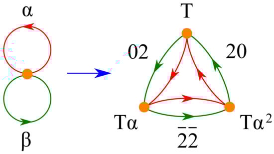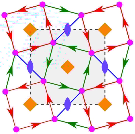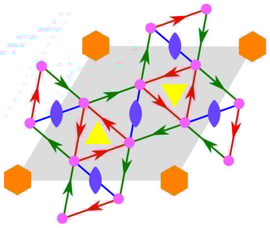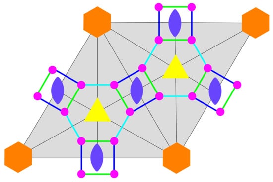 It is easily verified that these matrices satisfy the relation , and, conversely, that the group generated by these two matrices is isomorphic to the abstract group . Because monomials of degree 3 have the identity as the rotation part, they generate a translation group T; in this case, with and . This group is normal in G, with only three cosets given, for example, as T, and . The determination of the labeled quotient graph of the derived net N and its identification are performed as explained above for sql. For instance, according to the voltages assigned to loops in the bouquet , the green edge outgoing from in goes to . After this vertex has been rewritten in the form , one can see that the respective edge goes from to and must be assigned voltage x. In particular, we have