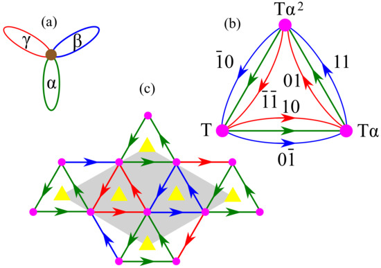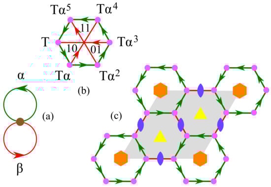 These operations satisfy the relations . Clearly, every monomial of degree 3 in , and defines a translation in the plane. The two combinations and can be used as a basis for the translation group T. Using the three cosets T, and , one may construct the labeled quotient graph shown in Figure 9b, which can then be unwrapped to the representation of the hxl net given in Figure 9c. The net hxl is thus isomorphic to the Caley color graph of with the three generators , and . We note again the correlation between strong rings of the net and relators of the space-group, in particular, the relator associated to the green–blue–red 3-cycle.
