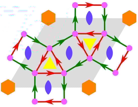 The htb (hexagonal tungsten bronze) net, shown in Figure 8, is described by the bouquet with a 6-fold rotation and a 3-fold rotation as voltages, with relator . The translation group T is generated by the two combinations and and admits six cosets given as . We note again the presence in the net of a two-color 4-cycle (strong ring), associated to the relator.