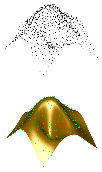 Application of our method to Example I: (top) given cloud of noisy data points; (bottom) noisy data points and best approximating Bézier surface.