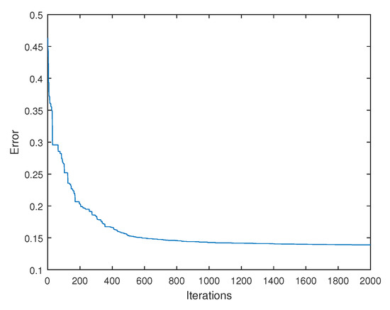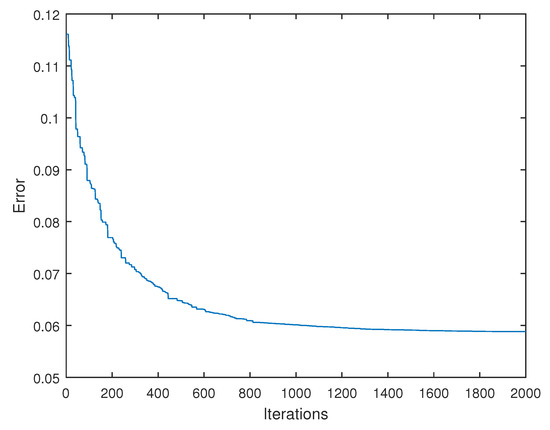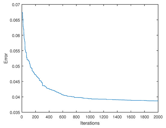 The convergence diagram for this example is shown in Figure 2. It displays the mean value of the error functional (first row of Table 2) over the iterations. As you can see, the error decreases very quickly at the beginning, and then reduces the declining speed until finally reaching a plateau value for about 1400 iterations. We can also see that the method converges in less than 2000 iterations.