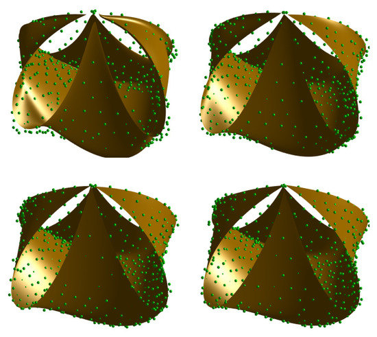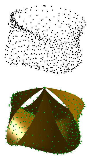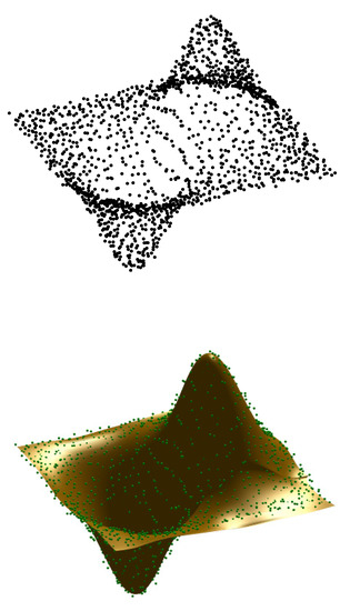 Figure 5 shows the results for the Example III. As mentioned above, it corresponds to a very difficult shape, as it includes self-intersections and multiple branches. Actually, even the underlying geometrical shape is difficult to discern from the cloud of 628 unorganized and noisy data points shown in the upper picture—in this case, the , corresponding to noise of low intensity. The best approximating Bézier surface corresponding to the degree is shown in the lower picture. It clearly shows that the four corners of the shape meet together at a cusp point, so the surface is actually self-intersecting. In spite of all these difficult features, the method performs pretty well and can replicate the original shape with high accuracy. Note, for instance, the nice visual matching between the original data points and the approximating surface. As usual, Figure 6 shows the convergence diagram for this example.
